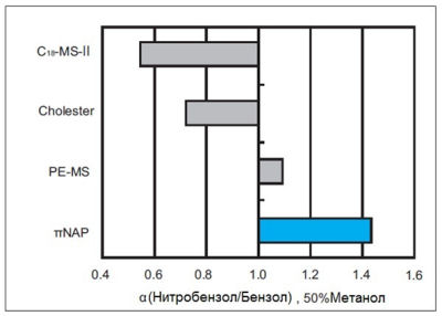 COSMOSIL πNAP демонстрирует более сильные π-π взаимодействия. Два его конденсированных ароматических кольца лучше удерживают нитробензол, чем фенильные колонки.