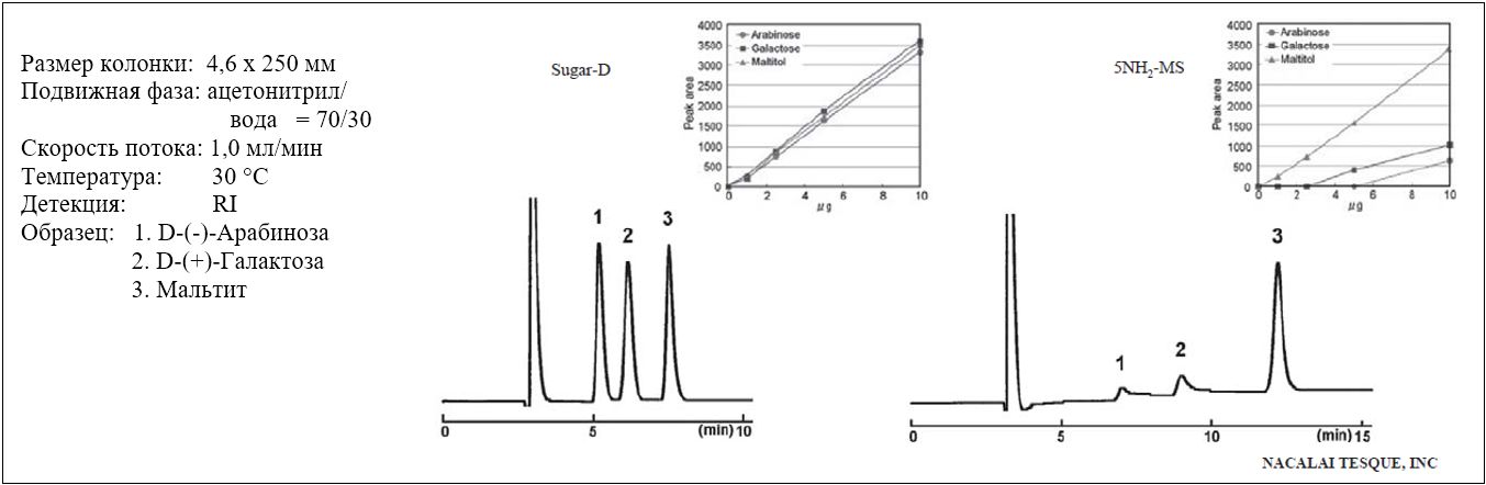 Некоторые типы сахаридов, например, арабиноза или галактоза, частично или полностью адсорбируются обычными аминопропильными неподвижными фазами, вызывая расширение пика или полное отсутствие элюирования. COSMOSIL Sugar-D обеспечивает прекрасное разделение и высокую степень восстановления для таких сахаридов.